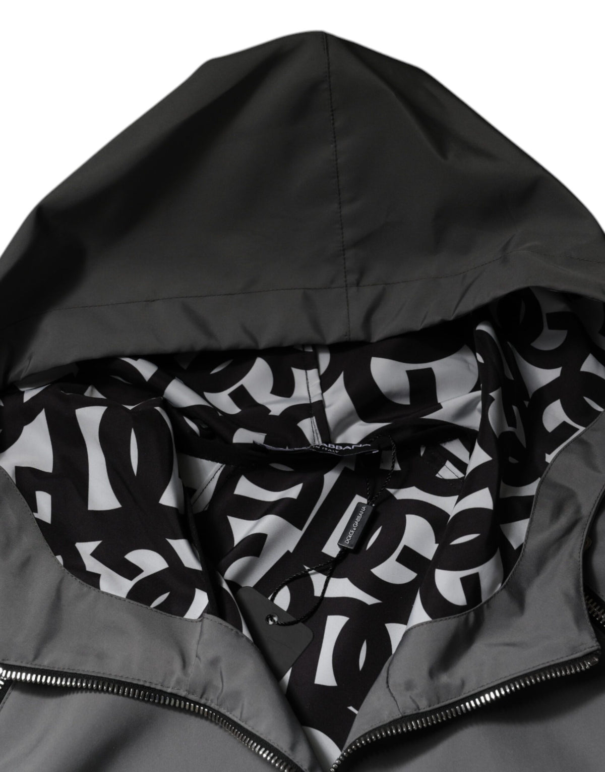 Absolutely stunning, 100% Authentic brand new with tags Dolce & Gabbana jacket featuring gray, polyester, DG logo, hooded, full zip fastening, long sleeves and pockets.