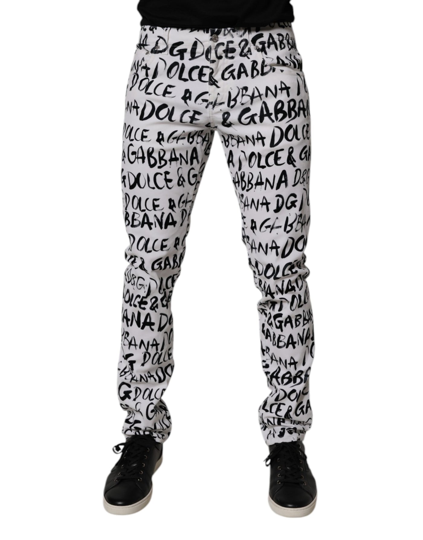 Dolce & Gabbana White Cotton Logo Print Skinny Denim Jeans