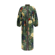 The Avery Chemisier Dress by Alemais is an elegant and feminine piece with a Korean collar that gives a refined touch. The front button closure and balloon sleeves create a balance between classic and modern. The floral pattern adds freshness to the design, while the knotted drawstring waist allows you to customize the fit, accentuating the silhouette. Perfect for a sophisticated and trendy look.