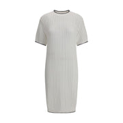 Brunello Cucinelli’s midi dress has a refined, casual design. The short-sleeved model is knitted with a ribbed crew neck that adds a touch of understated elegance. The contrasting colored hems enrich the garment with a modern and dynamic detail. A versatile dress, perfect for a chic and comfortable look, suitable for a variety of occasions.