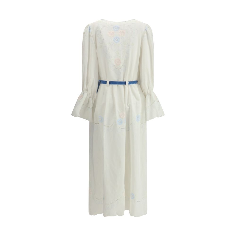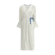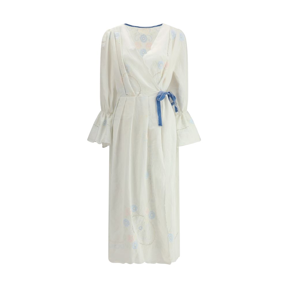 Ella’s Impero Long Dress is a garment with timeless appeal, combining elegance and sophistication in a sophisticated design. Its crossover front, combined with a closure via a knotted velvet ribbon at the waist, enhances the figure with a sleek silhouette. Long puff sleeves add a touch of romance, while sangallo lace inserts lend a delicate contrast of texture. The deep V-neckline and all-over embroidered flowers further embellish the dress, lending an air of femininity and elegance.