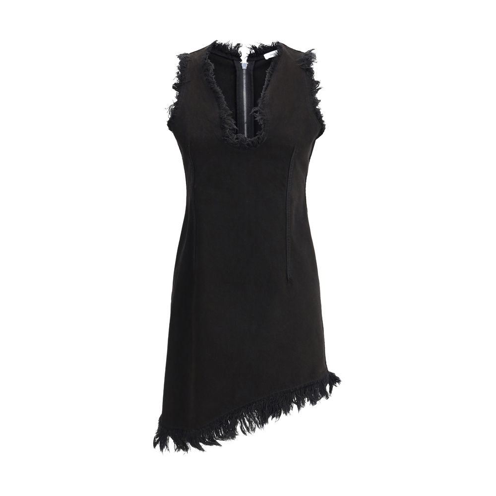 Ferragamo’s cotton mini Dress is a sleek, modern piece with a back zipper closure and sleeveless design. The denim design lends a casual touch, while the front neckline and frayed details along the edges add an element of character. The asymmetrical hemline completes the look, making it versatile and fashionable.