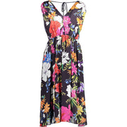 long dress, wide straps, "v" neckline, lacing at the neck, elastic waistband, logo