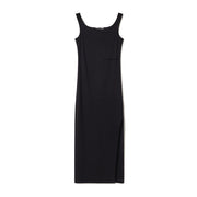 Hinnominate long rib dress with off-the-shoulder cutouts and side slits, rubber logo on the chest