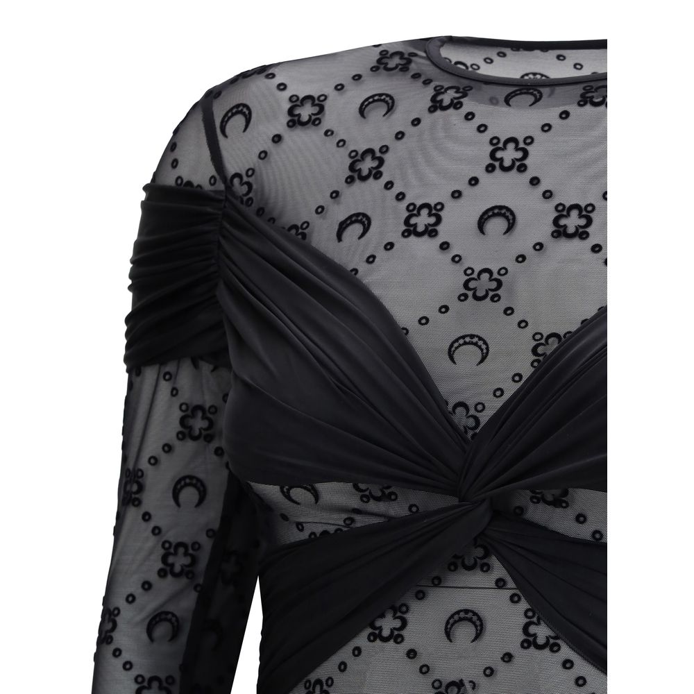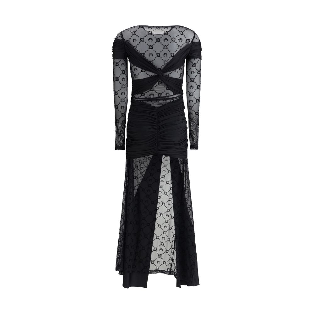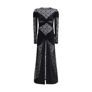 The Draped Long Dress by Marine Serre features a sophisticated design with semi-sheer long sleeves, which add a touch of sensuality and elegance. The classic crew neck balances the transparency of the sleeves, creating a harmonious look. The draping detail on the front and back gives movement and structure to the garment, while the slit on the back adds dynamism. The iconic pattern of the brand, distributed throughout the dress, adds a distinctive and bold touch, making this dress a unique and fascinating piece.