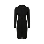Pinko dress in technical stretch viscose fabric with a fluid neoprene effect and a gathered georgette band detail on the chest. Fitted line with a shirt collar and long sleeves. Front metal zip fastening