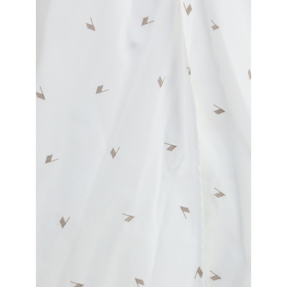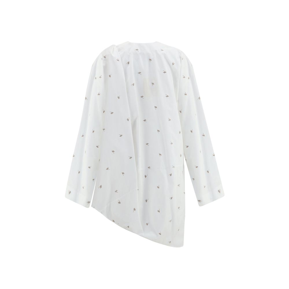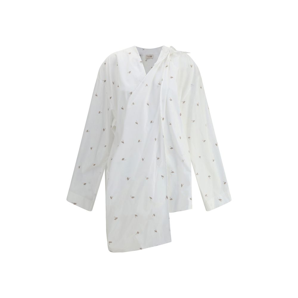 Cotton Dress by The Attico combines comfort and style in a distinctive design. The front V-neck is complemented by a button closure that adds a touch of casual elegance. The garment is embellished with the iconic all-over contrasting embroidered logo for a bold and recognizable graphic effect. The long, wide sleeves give volume and movement, while the asymmetric hem creates a dynamic silhouette. Two wide side sashes, to be knotted and looped over the shoulder, add versatility and a contemporary sartorial accent.