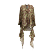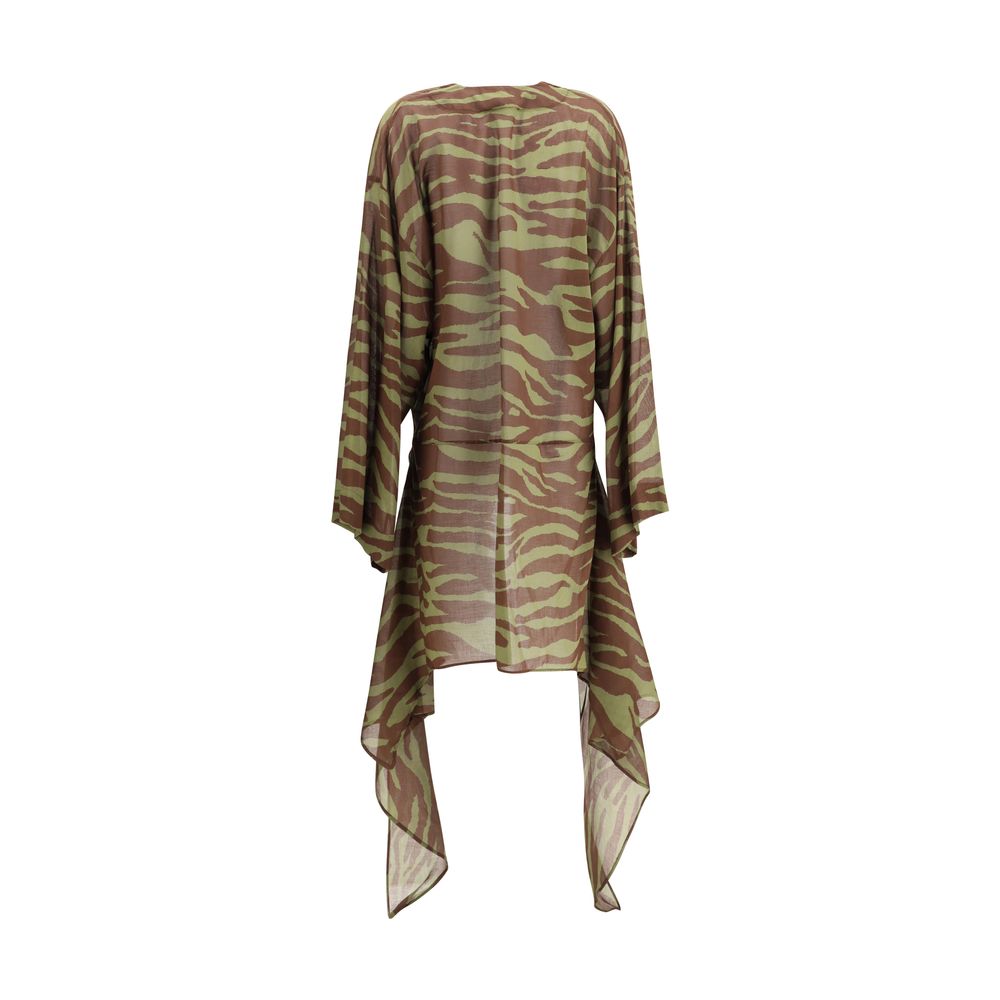 The asymmetrical cotton Dress with wide sleeves by The Attico is a contemporary style statement. Featuring a V-neckline at the front and long, voluminous sleeves, it has a front button closure that emphasizes its casual elegance. The refined design features an asymmetrical silhouette, with the back panel longer than the front, creating a dynamic and sophisticated silhouette. Two wide side sashes, which can be knotted and passed over the shoulder or worn loosely in a sarong style, add versatility and a tailored touch. The semi-transparent animal-patterned fabric completes the look with bold, sensual elegance.