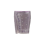Mini Skirt in Metal Fabric with Retrofête Applications. Wisteria-colored metal net fabric, internal lining, side button closure and internal button closure, crystal and bead applications, asymmetric line.