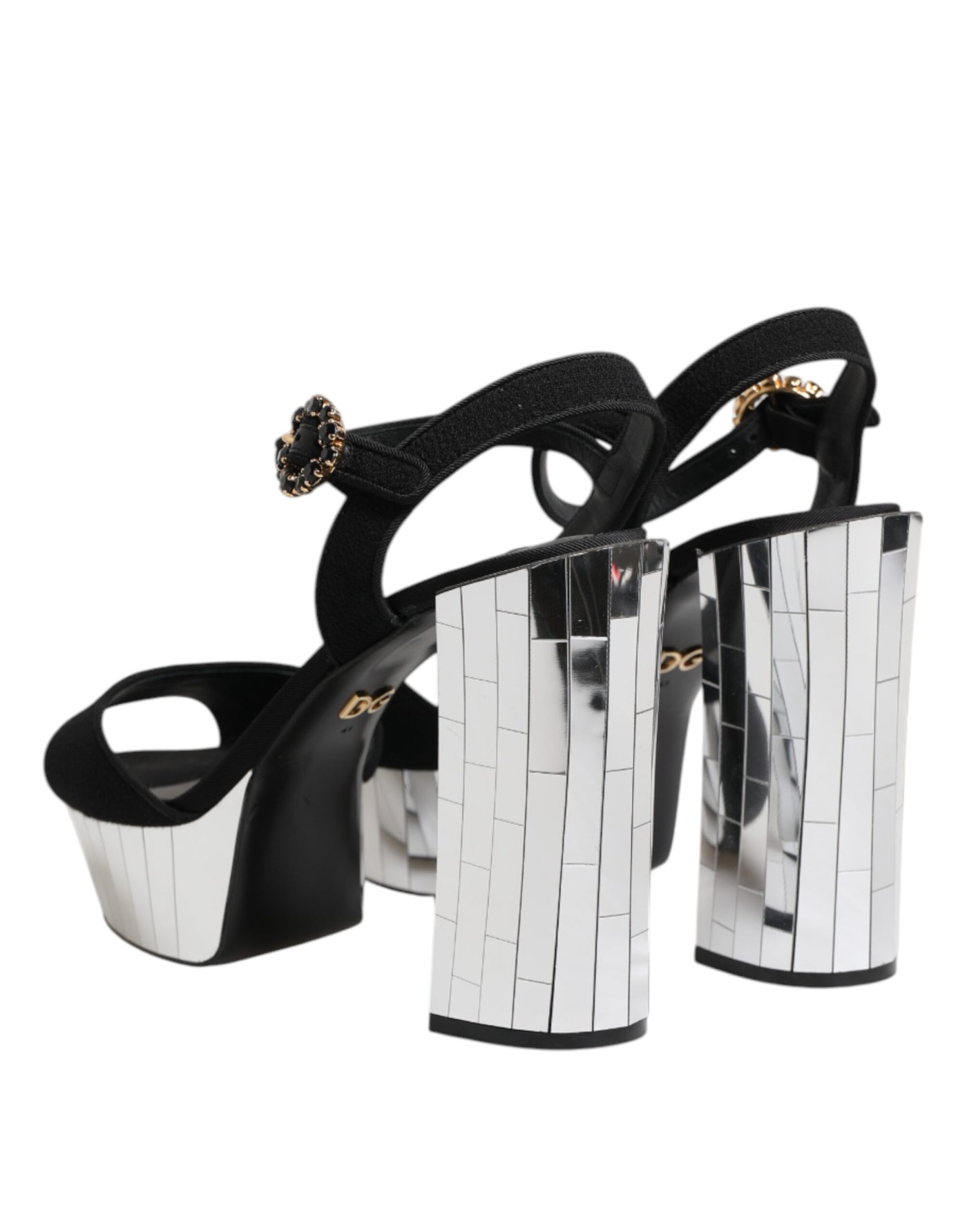 Gorgeous brand new, 100% Authentic DOLCE & GABBANA sandals featuring mirrored heels and adjustable ankle strap. Model: Ankle strap sandals Color: Black, Silver Material: 90% Wool 7% Viscose 3% Capra Sole: Leather Black crystals Buckle closure Logo Details Made in Italy Very exclusive and high craftsmanship